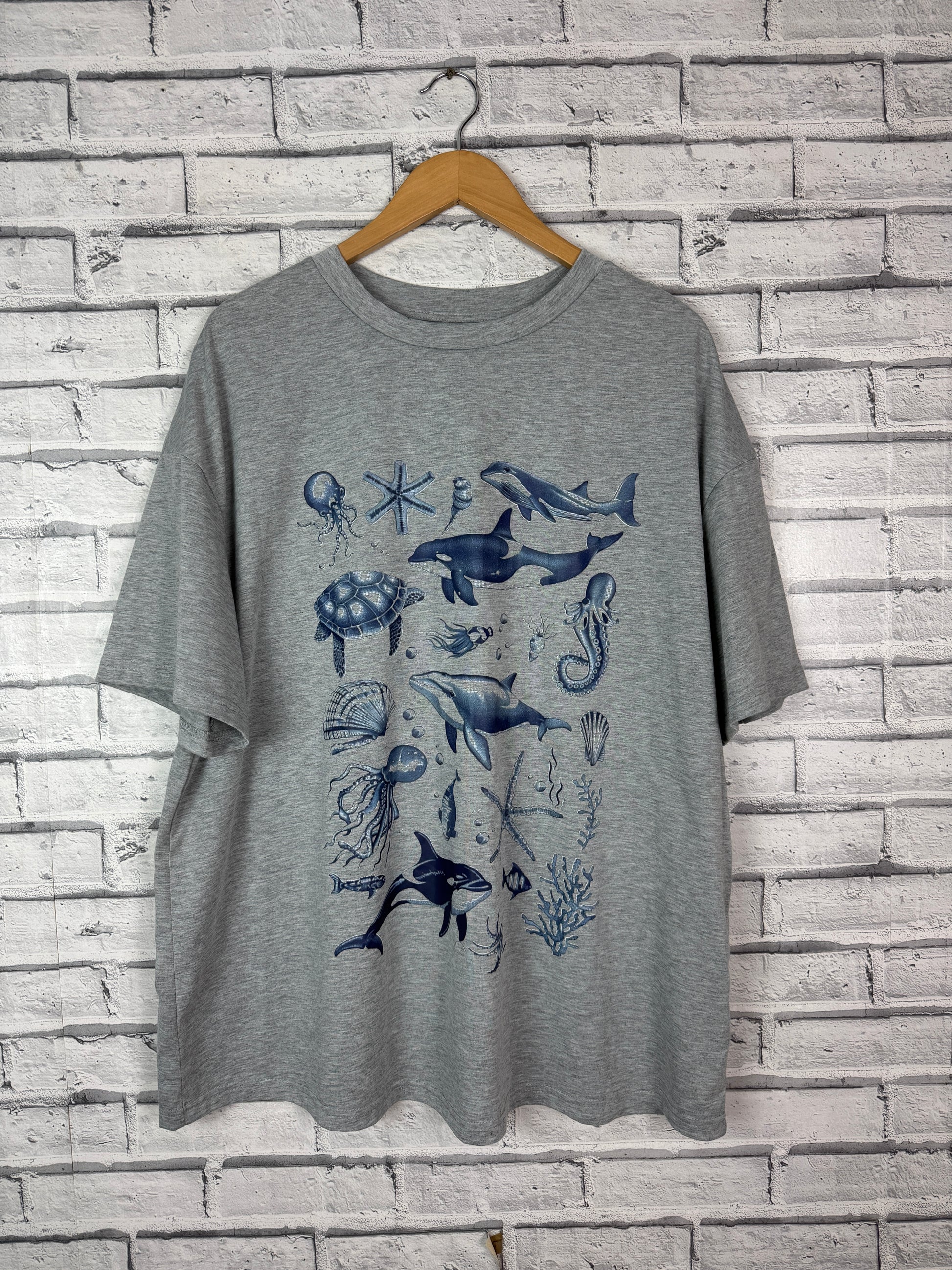 Vintage Vibes Grey Unisex Sealife Marine Fish Whale Graphic Print T-Shirt XXL
